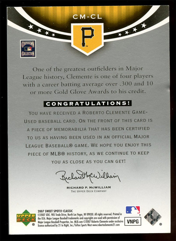 2007 Sweet Spot Classic Roberto Clemente CM-CL Classic Memorabilia